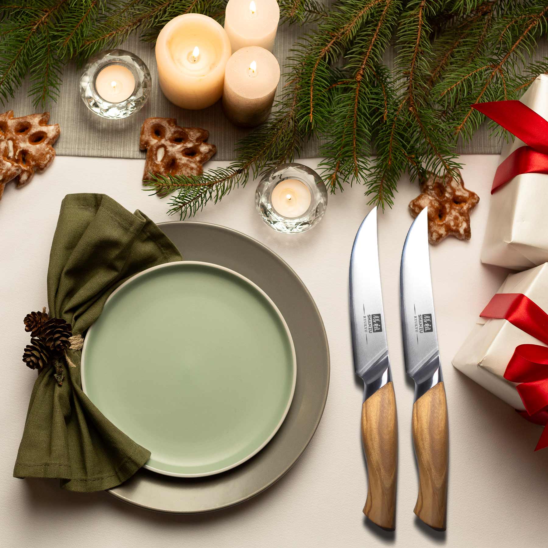 Set de 6 couteaux à steak aiguisés comme des rasoirs avec manche en bois d'olivier