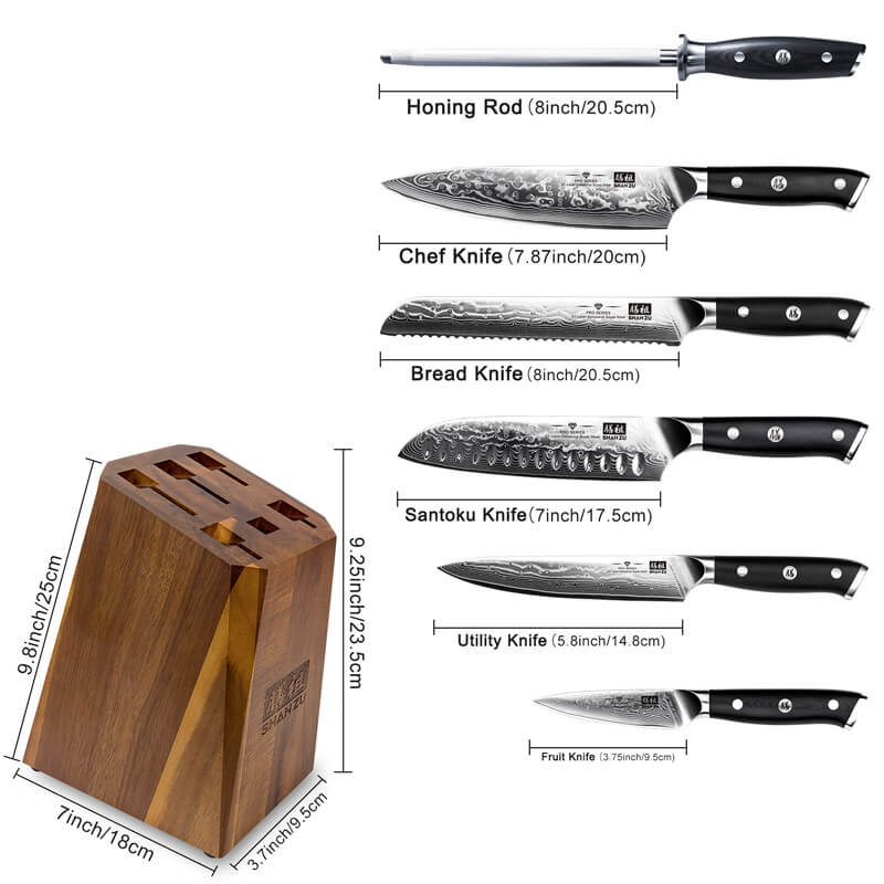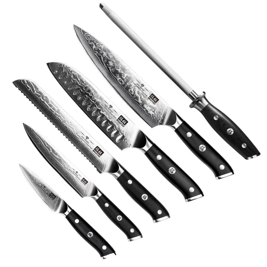 SHAN ZU PRO | Bloc de couteaux Damas 7-Pcs+ Pierre à aiguiser